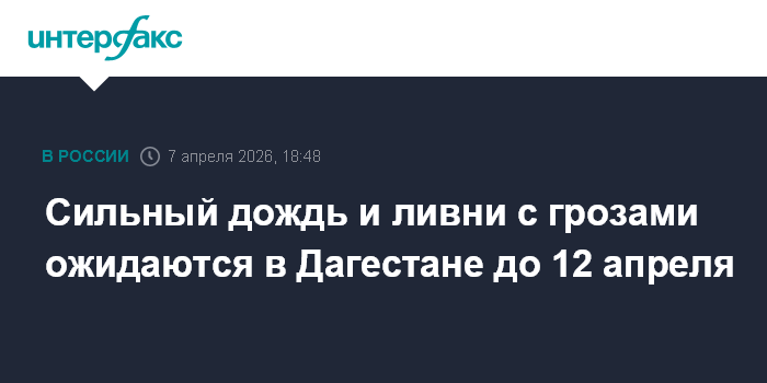 Москва. 7 апреля. INTERFAX.RU - Сильный дождь прогнозируется в Дагестане в период до 12 апреля, количество выпавших осадков может доходить до 20-30 мм, сообщила "Интерфаксу" ведущий сотрудник Гидрометцентра России Марина Макарова.