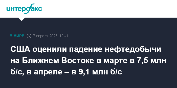 Москва. 7 апреля. INTERFAX.RU - Добыча нефти в ближневосточных странах, Саудовской Аравии, Ираке, Кувейте, ОАЭ, Катаре и Бахрейне из-за военного конфликта, повлекшего закрытие Ормузского пролива, в марте упала на 7,5 млн баррелей в сутки, оценивает управление энергетической информации Минэнерго США (EIA) в своем ежемесячном отчете.