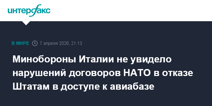 Москва. 7 апреля. INTERFAX.RU - Министр обороны Италии Гуидо Крозетто во вторник заявил, что Рим не нарушает какие-либо соглашения, заключенные в рамках НАТО, когда не дает США разрешение воспользоваться авиабазой НАТО на итальянской территории в ходе американской операции против Ирана.