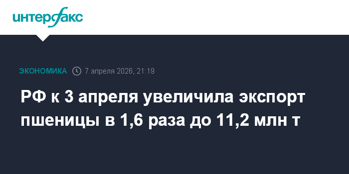 РФ к 3 апреля увеличила экспорт пшеницы в 1,6 раза до 11,2 млн т