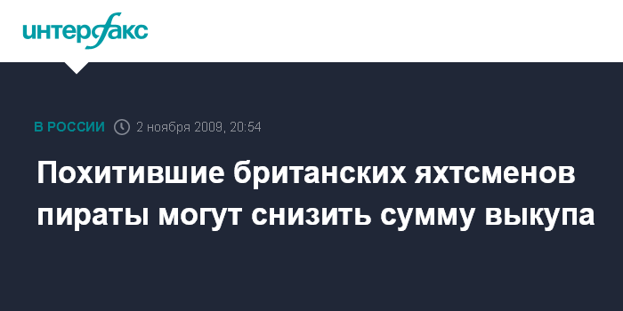 Лондон. 2 ноября. INTERFAX.RU - Сомалийские пираты могут освободить двоих британских яхтсменов за значительно меньшую сумму, чем 4,2 млн фунтов стерлингов, приводит британская телекомпания Sky News слова Эндрю Мвангуры, координатора Программы по поддержке моряков в Восточной Африке.