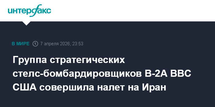 Москва. 7 апреля. INTERFAX.RU - Три американских стратегических стелс-бомбардировщика B-2A Spirit с понедельника на вторник участвовали в очередном рейде на иранские военные объекты, следует из данных авиационного ресурса Military Air Tracking Alliance (MATA).