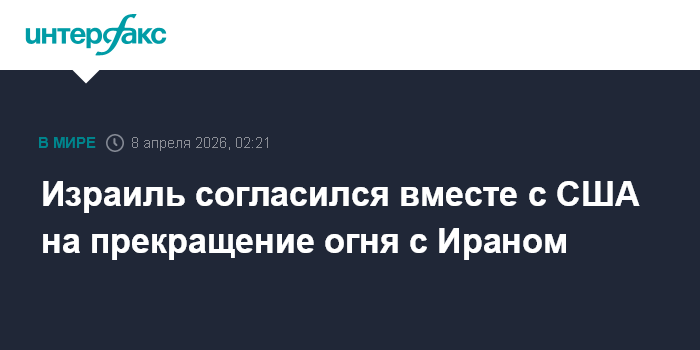 Москва. 8 апреля. INTERFAX.RU - Израиль вместе с США согласился на временное прекращение огня с Ираном, сообщает телеканал CNN со ссылкой на неназванного высокопоставленного представителя Белого дома.