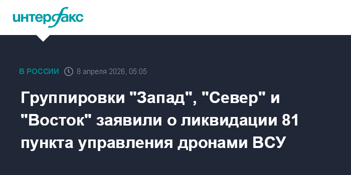 Москва. 8 апреля. INTERFAX.RU - Российские военные заявили об уничтожении в зоне ответственности группировок "Запад", "Север" и "Восток" 81 пункта управления беспилотниками украинской армии.