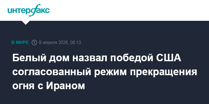 Москва. 8 апреля. INTERFAX.RU - Пресс-секретарь Белого дома Кэролайн Левитт назвала согласованный режим прекращения огня с Ираном победой США, в дальнейшем открывающей дорогу дипломатическому урегулированию и долгосрочному миру.