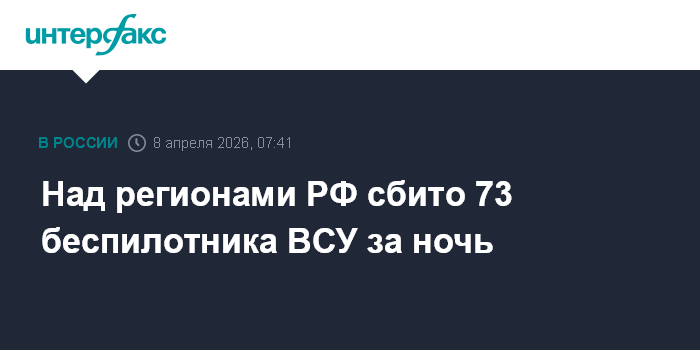 Москва. 8 апреля. INTERFAX.RU - Дежурными средствами ПВО с 20:00 мск вторника до 07:00 мск среды над регионами России уничтожены и перехвачены 73 украинских беспилотника самолетного типа, сообщили в Минобороны РФ.