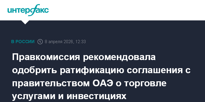 Москва. 8 апреля. INTERFAX.RU - Правительственная комиссия по законопроектной деятельности рекомендовала одобрить законопроект о ратификации соглашения о торговле услугами и инвестициях между правительством Российской Федерации и правительством Объединенных Арабских Эмиратов, сообщил "Интерфаксу" источник, знакомый с соответствующим документом.