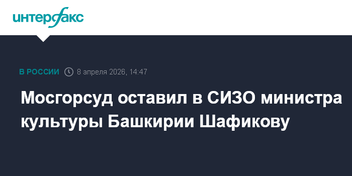 Москва. 8 апреля. INTERFAX.RU - Мосгорсуд оставил под стражей министра культуры Башкирии Анну Шафикову, сообщила пресс-служба судов общей юрисдикции Москвы.