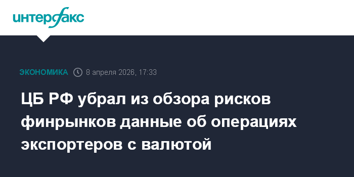 Москва. 8 апреля. INTERFAX.RU - ЦБ РФ убрал из обзора рисков финансовых рынков данные об операциях крупнейших экспортеров с валютой.