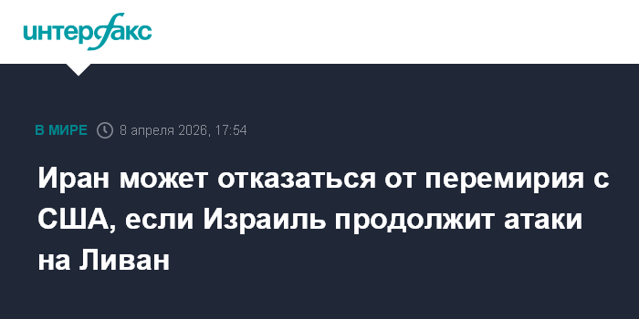 Москва. 8 апреля. INTERFAX.RU - Иран может выйти из соглашения с США о прекращении огня, если Израиль продолжит наносить удары по территории Ливана, сообщает в среду агентство Tasnim со ссылкой на источник из числа иранских официальных лиц.