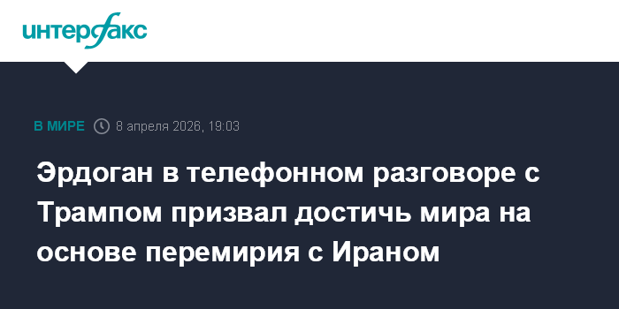 Москва. 8 апреля. INTERFAX.RU - Президент Турции Реджеп Тайип Эрдоган обсудил по телефону с президентом США Дональдом Трампом перемирие на Ближнем Востоке, сообщает в среду "Сабах".
