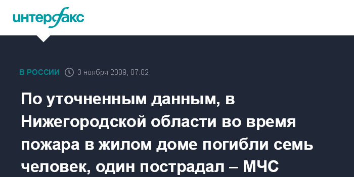 Нижний Новгород. 3 ноября. ИНТЕРФАКС-ПОВОЛЖЬЕ - По уточненным данным, 7 человек погибли и один пострадал в результате пожара в деревянном многоквартирном жилом доме в городе Балахна Нижегородской области в ночь на вторник.