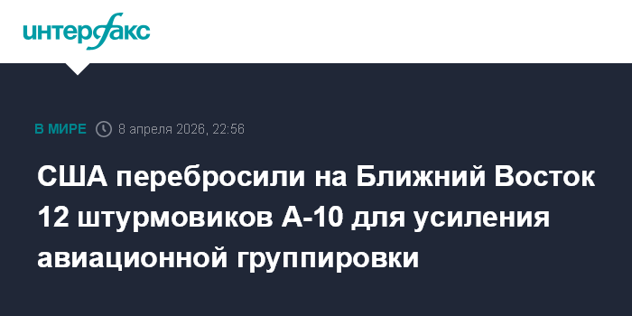 Москва. 8 апреля. INTERFAX.RU - Пентагон в среду перебросил на Ближний Восток для усиления американской авиационной группировки эскадрилью из 12 штурмовиков A-10 Thunderbolt II, сообщил авиационный ресурс Military Air Tracking Alliance (MATA).