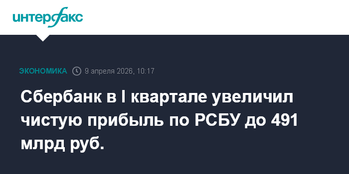Москва. 9 апреля. INTERFAX.RU - Сбербанк в I квартале 2026 года увеличил чистую прибыль по РСБУ на 21,4% - до 491 млрд руб., говорится в сообщении банка.