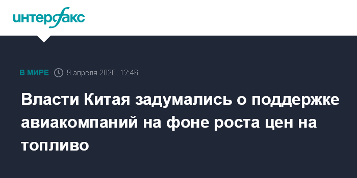 Москва. 9 апреля. INTERFAX.RU - Правительство Китая рассматривает возможность оказания финансовой помощи и другой поддержки государственным авиакомпаниям, пострадавшим от взлета цен на авиатопливо на фоне конфликта на Ближнем Востоке, пишет Bloomberg со ссылкой на источники.