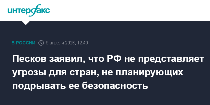 Москва. 9 апреля. INTERFAX.RU - Россия не представляет угрозы ни для одной страны, которая не собирается подрывать ее безопасность, заявил пресс-секретарь президента РФ Дмитрий Песков.
