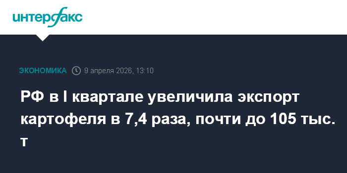 Москва. 9 апреля. INTERFAX.RU - РФ в первом квартале 2026 года экспортировала 104,6 тыс. тонн картофеля, что в 7,4 раза больше, чем за аналогичный период прошлого года (14,1 тыс. тонн), сообщает Россельхознадзор со ссылкой на данные системы "Аргус-Фито".