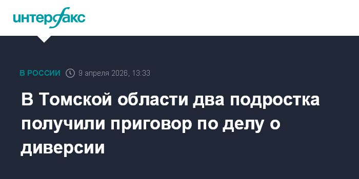 Москва. 9 апреля. INTERFAX.RU - В Томской области Северский городской суд признал двух подростков виновными в диверсии на железной дороге (ч. 1 ст. 281 УК) и поместил их в специальное учебно-воспитательное учреждение закрытого типа на 2 года и 7 месяцев каждого, сообщило областное УФСБ.