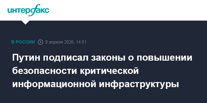 Москва. 9 апреля. INTERFAX.RU - Президент РФ Владимир Путин подписал законы, направленные на повышение безопасности критической информационной инфраструктуры.