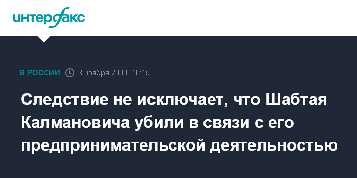 Москва. 3 ноября. INTERFAX.RU – Следствие рассматривает несколько версий убийства бизнесмена Шабтая Калмановича, сообщил "Интерфаксу" официальный представитель СКП РФ Владимир Маркин.
