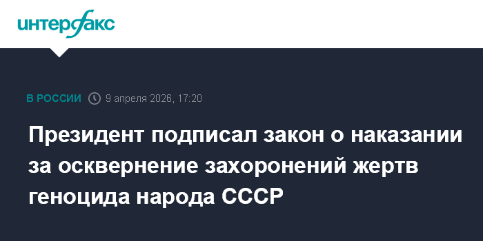Москва. 9 апреля. INTERFAX.RU - Президент Владимир Путин подписал закон, который направлен на усиление защиты исторической памяти и вводит уголовное наказание за осквернение захоронений жертв геноцида советского народа. Закон опубликован.