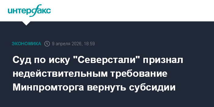 Москва. 9 апреля. INTERFAX.RU - Арбитражный суд Москвы удовлетворил иск "Северстали", признав недействительными требования Минпромторга о возврате субсидии. Как сказано в картотеке арбитражных дел, арбитраж принял постановление "признать ненормативный правовой акт недействительным полностью".