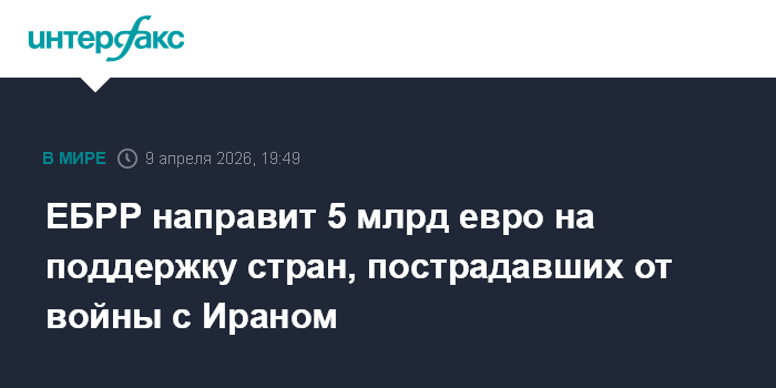 Москва. 9 апреля. INTERFAX.RU - Европейский банк реконструкции и развития (ЕБРР) объявил о намерении в 2026 году выделить 5 млрд евро на поддержку экономик стран, пострадавших от конфликта на Ближнем Востоке.