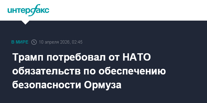 Москва. 10 апреля. INTERFAX.RU - Президент США Дональд Трамп в ходе встречи в среду с генсеком НАТО Марком Рютте потребовал принятия членами альянса срочных конкретных мер по обеспечению безопасности Ормузского пролива, передает CNN со ссылкой на европейские дипломатические источники.
