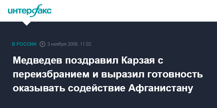 Москва. 3 ноября. INTERFAX.RU – Президент России Дмитрий Медведев направил поздравление президенту Исламской Республики Афганистан Хамиду Карзаю в связи с переизбранием на этот пост.