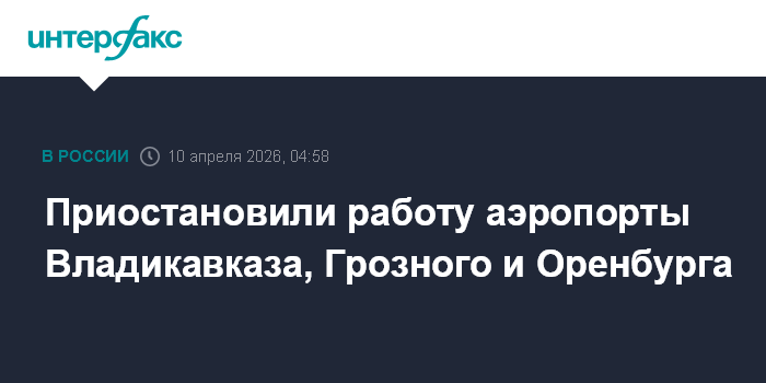 Москва. 10 апреля. INTERFAX.RU - Временные ограничения на прием и отправку самолетов введены в аэропортах Грозного, Владикавказа и Оренбурга, сообщили в Росавиации.