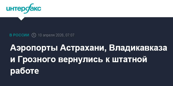 Москва. 10 апреля. INTERFAX.RU - Временные ограничения сняты в аэропортах Астрахани, Владикавказа, Грозного, сообщили в Росавиации.