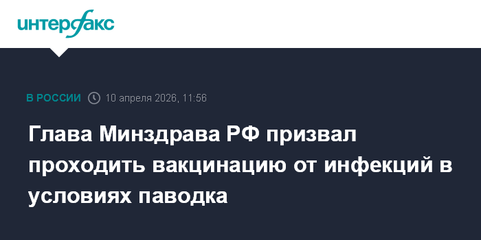 Москва. 10 апреля. INTERFAX.RU - Министр здравоохранения России Михаил Мурашко призвал граждан проходить вакцинацию от инфекционных заболеваний в условиях паводка и соблюдать рекомендации медиков.