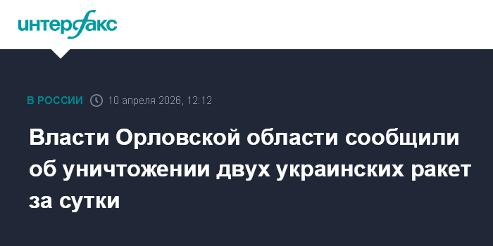 Москва. 10 апреля. INTERFAX.RU - Губернатор Орловской области Андрей Клычков сообщил об уничтожении двух украинских ракет в регионе за минувшие сутки.