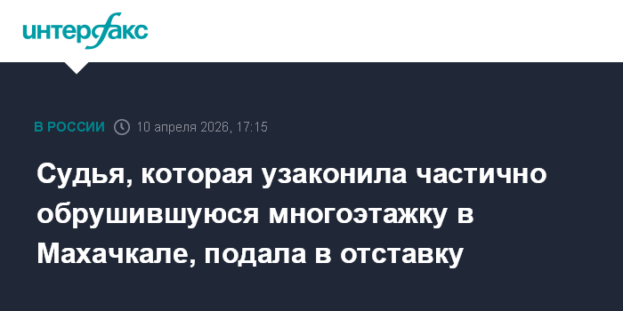Москва. 10 апреля. INTERFAX.RU - Квалификационная коллегия судей (ККС) Дагестана рассмотрит отставку судьи Советского районного суда Махачкалы Патимат Махатиловой, которая в 2013 году узаконила многоэтажный дом в Махачкале, который в апреле 2026 года частично обрушился из-за наводнения, сообщили "Интерфаксу" в объединенной пресс-службе судов республики.