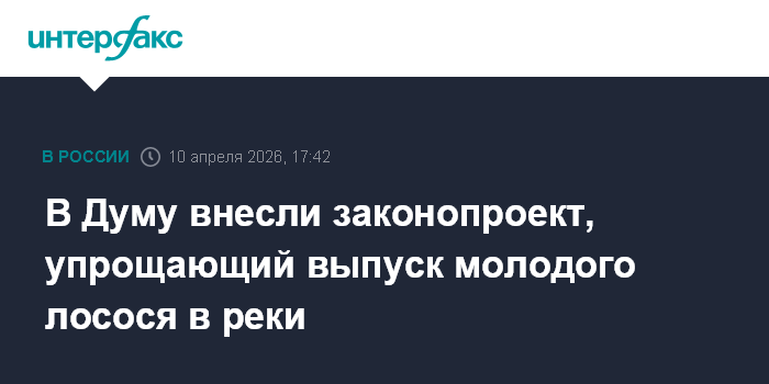 Москва. 10 апреля. INTERFAX.RU Законодательное собрание Камчатского края внесло в Госдуму законопроект, меняющий порядок выпуска выращенного на рыбозаводах молодого тихоокеанского лосося в реки.