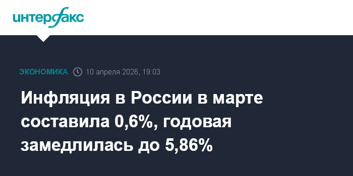 Годовая инфляция, по данным Росстата, в марте 2026 года замедлилась до 5,86% (аналитики ожидали 5,84%) с 5,91% на конец февраля. На конец января годовая инфляция равнялась 6%, на конец декабря - 5,59%.