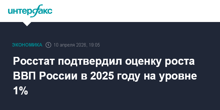 Москва. 10 апреля. INTERFAX.RU - Росстат подтвердил оценку роста ВВП в 2025 году на уровне 1% (была опубликована в феврале). В сообщении ведомства дана вторая оценка ВВП за 2025 год и актуализированы квартальные данные за 2025 год.