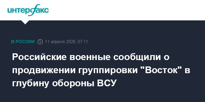 Москва. 11 апреля. INTERFAX.RU - Группировка войск "Восток" в течение суток продвинулась в глубину обороны вооруженных сил Украины, сообщили в пресс-центре группировки в субботу.