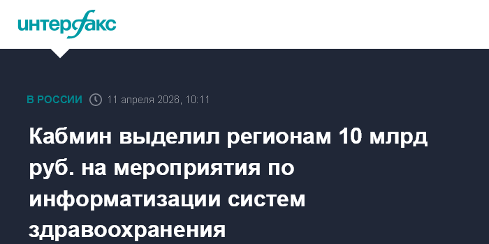 Москва. 11 апреля. INTERFAX.RU - Регионы России получат 10 млрд рублей на реализацию мероприятий по информатизации систем здравоохранения, сообщили в пресс-службе правительства РФ в субботу.