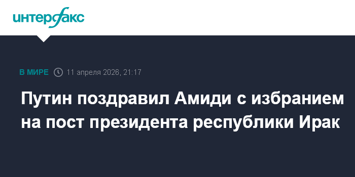 "Уважаемый господин Амиди, примите искренние поздравления по случаю Вашего избрания Президентом Республики Ирак", - говорится в сообщении, опубликованном на сайте Кремля.
