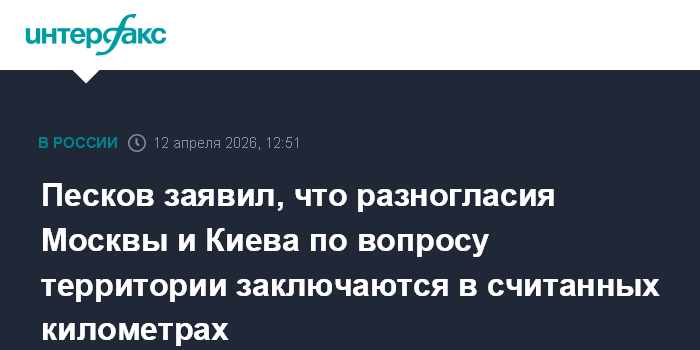 Москва. 12 апреля. INTERFAX.RU - Разногласия Москвы и Киева по территориальному вопросу заключаются в считанных километрах, России осталось освободить 18-17% ДНР для выхода на административные границы, заявил пресс-секретарь президента РФ Дмитрий Песков.