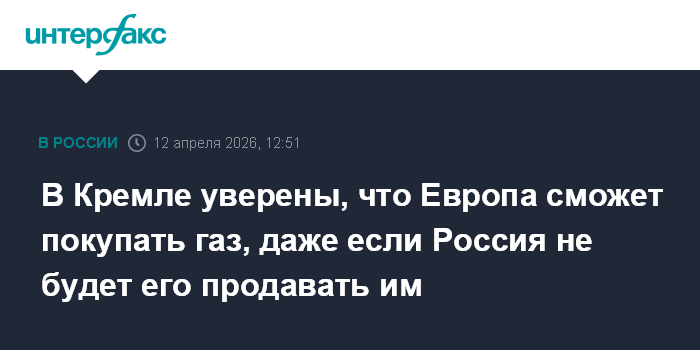 Москва. 12 апреля. INTERFAX.RU - Даже если Россия не будет продавать газ европейским странам, они найдут способ его купить, заявил пресс-секретарь президента РФ Дмитрий Песков.