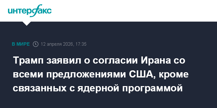 Москва. 12 апреля. INTERFAX.RU - Президент США Дональд Трамп заявил Fox news, что на состоявшихся в Исламабаде переговорах с Ираном тот пошел навстречу всем запросам Вашингтона, кроме тех, что относились к ядерной программе.