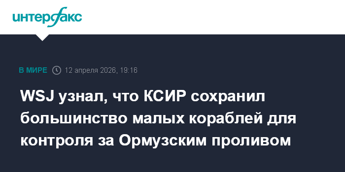Москва. 12 апреля. INTERFAX.RU - Более 60% малого военно-морского флота Корпуса стражей исламской революции (КСИР), отвечающего за патрулирование Ормузского пролива, остается в целости и сохранности после шестинедельной американо-израильской операции, сообщила газета The Wall Street Journal.