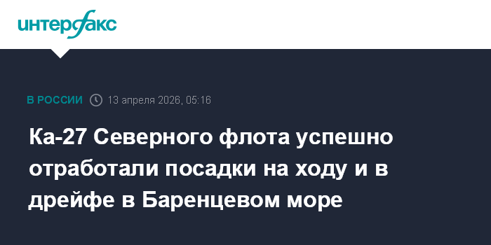 Москва. 13 апреля. INTERFAX.RU - Экипажи вертолётов Ка-27 отдельного корабельного противолодочного вертолётного полка смешанного авиационного корпуса Северного флота отработали взаимодействие с большим противолодочным кораблём "Адмирал Левченко", сообщает пресс-служба Северного флота.