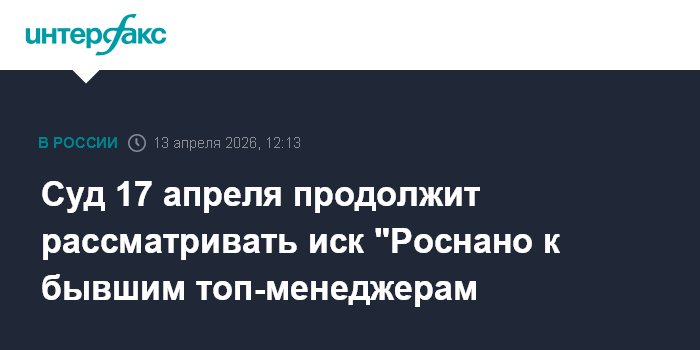 Суд 17 апреля продолжит рассматривать иск "Роснано к бывшим топ-менеджерам