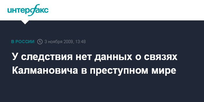 Москва. 3 ноября. INTERFAX.RU - В московском управлении СКП РФ не обладают информацией о возможных криминальных связях бизнесмена Шабтая Калмановича, убитого вечером в понедельник в центре Москвы.