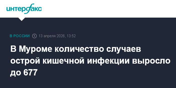 Москва. 13 апреля. INTERFAX.RU - В Муроме число заболевших острой кишечной инфекцией выросло до 677, среди них 318 детей, сообщила пресс-служба правительства Владимирской области. Учитываются случаи, выявленные с 7 по 13 апреля.