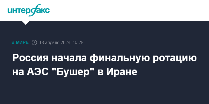 Москва. 13 апреля. INTERFAX.RU - Россия в понедельник в 8:00 утра начала финальную ротацию на атомной электростанции "Бушер" в Иране, 108 сотрудников покидают станцию, на объекте остаются 20 человек, сообщил журналистам глава Росатома Алексей Лихачев.