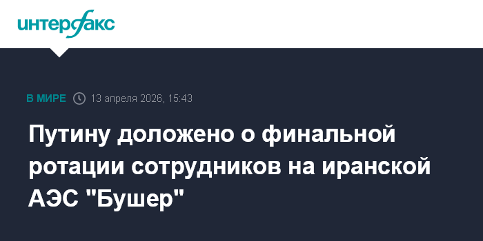 Москва. 13 апреля. INTERFAX.RU - Президенту России Владимиру Путину доложено о финальной ротации сотрудников на иранской атомной электростанции "Бушер", сообщил журналистам глава "Росатома" Алексей Лихачев.